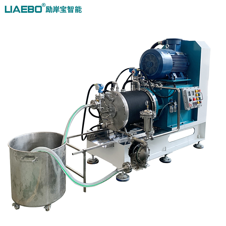 采用循環(huán)研磨工藝,環(huán)保節(jié)能、勞動強(qiáng)度小。配制好的原始漿料,經(jīng)過第一遍粗略研磨后,泵入循環(huán)攪拌罐,經(jīng)底部泵輸送進(jìn)入納米研磨機(jī);一邊經(jīng)過研磨后送入循環(huán)罐,與未曾研磨過的物料通過攪拌機(jī)快速混亂,一邊又通過底部泵入砂磨機(jī),周而復(fù)始直到達(dá)成研磨要求。一般而言,罐的容積是砂磨機(jī)流量的1/4。采用循環(huán)研磨工藝或多次研磨工藝能使產(chǎn)能提高,產(chǎn)品顆粒級配分布得以優(yōu)化。稍加一些控制功能,可保證產(chǎn)品的可復(fù)制性及節(jié)省成本。大尺寸轉(zhuǎn)子加上筒狀縫隙式分離器,使該型設(shè)備可使用不同材質(zhì)小顆粒珠子。對于防金屬污染的物料,可采用陶瓷(碳氮化硅,氧化鋯)及聚氨酯結(jié)構(gòu)材料。