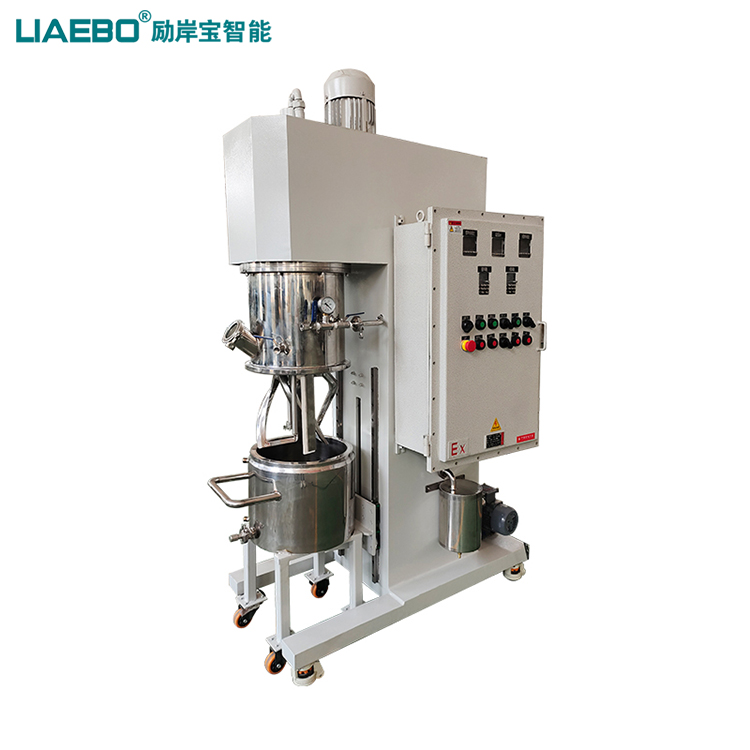 雙行星真空攪拌機是一種高性能、高效率、易清洗維護的新型攪拌設(shè)備。主要由減速電機、行星架、攪拌器、分散器、刮壁器、料桶、升降系統(tǒng)、液壓擠出系統(tǒng)以及機架等構(gòu)成,設(shè)備的雙組攪拌器運行時自轉(zhuǎn)同時繞著軸心進行公轉(zhuǎn),攪拌器形式根據(jù)物料粘度和工藝特性選配,常見的包括漿葉式、麻花式、爪式、框式等,具備良好的混合、反應(yīng)、捏合、溶解的作用;高速分散器由多層具備極高線速度的鋸齒狀分散盤組成,它同樣在高速自轉(zhuǎn)的同時繞著軸心進行公轉(zhuǎn),能夠?qū)⒎哿?助劑)快速的分散到漿料里,具備很強的分散作用。設(shè)備配有一組獨立刮刀,對桶壁進行不斷的刮拭,同時攪拌漿葉可以增加刮片,對料桶底部進行刮拭,避免攪拌死角,確保產(chǎn)品的穩(wěn)定性;雙行星真空攪拌機傳動采用行星齒輪傳動,有較大的輸出扭矩,適用干高溫、高固,高粘度等高難度工況;該設(shè)備采用密閉式設(shè)計,可以配合真空系統(tǒng),實現(xiàn)真空攪拌,攪拌桶也可設(shè)計帶夾套加熱,配合模溫機,實現(xiàn)恒溫攪拌功能,是市場上針對高粘度物料的分散、攪拌設(shè)備。